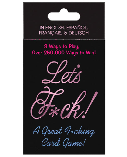 The quick and easy game that gets you laid! Includes 48 Let's F... Cards, 4 Let's Fck Wild Cards, and rules for 3 games: Fck Fortunes, Match & Fck, and Personal Fck Questions. One size fits most.