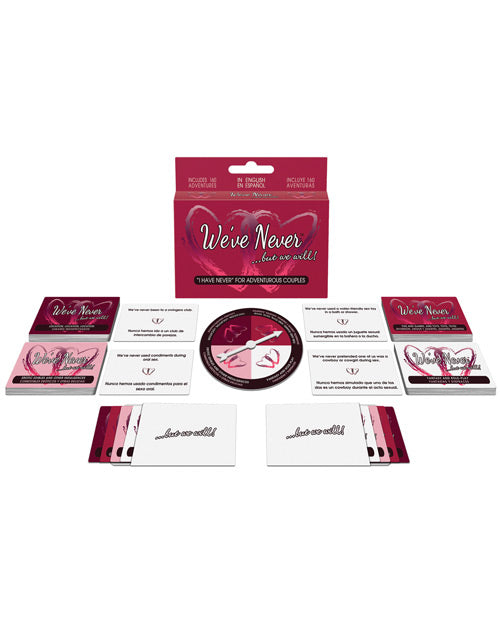 Hours and Weeks of Adult Fun! A couple reads the We've Never cards, from Kheper Games, to each other and celebrates what they have done together. If they have not done the sexual activity on a card, but decide that they would want to do it in the future, they save the card and toast the adventure. Play with your favorite beverages and toast what you have done and what you will do, or simply build up a collection of new sexual encounters for future use. Includes: 40 Location, Location cards; 40 Fun and Games, and Toys, Toys, Toys! Cards; 40 Erotic Edibles and Other Indulgences cards; 40 Fantasy and Role-Play cards; 2 ...but we will! envelopes; 1 spinner and game rules.