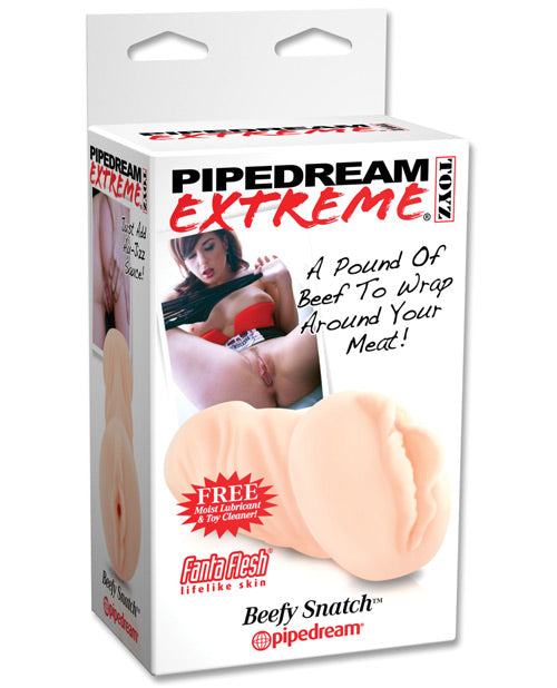The Pipedream Extreme Beefy Snatch. Today's Special: A hearty helping of Beefy Snatch, with a savory serving of extra moist meat curtains on the side! Satisfy your craving for cunt with this perfect portion of 100% prime pink pastrami. Our Grade-A Beefy Snatch is aged to perfection, marinated with love, and made fresh daily! Roast beef lovers rejoice-we have your recipe for raunch! Just make sure to add the works and load it up with gobs of creamy man mayo when you're done! Eat 'em, lick 'em, suck 'em or fuck 'em, you're gonna love every last morsel of this succulent snatch! When you're done feasting, drizzle it with ball juice for dessert! Bon appetit! Made of TPE and TPR.