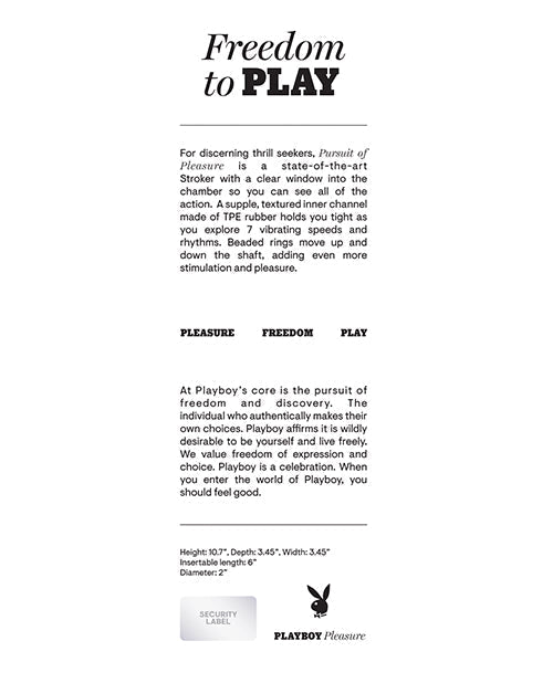 For discerning thrill seekers, Pursuit of Pleasure is a state-of-the-art Stroker with a clear window into the chamber so you can see all of the action. A supple, textured inner channel made of TPE rubber holds you tight as you explore 7 vibrating speeds and rhythms. Beaded rings move up and down the shaft, adding even more stimulation and pleasure.