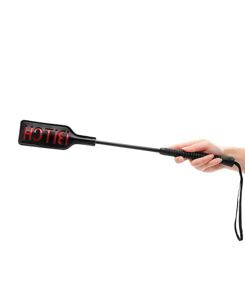 Leave a lasting impression on your partner. This short handled rectangular shaped crop is the perfect way to discipline your partner. Leave a lasting impression on your sub. The word BITCH is reversed so it will show up on their skin.